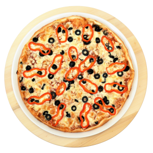 Sos pizza, piept de pui, ardei, masline, mozzarella, oregano.