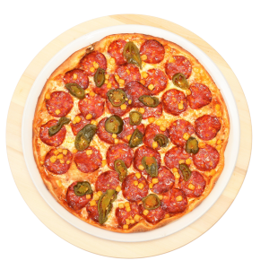 Sos pizza, salam picant, porumb, ardei iute, mozzarella, oregano.