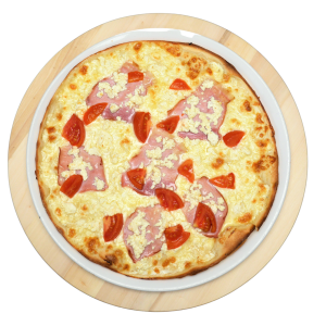 Sos pizza, sunca, bacon, masline, ciuperci, ardei, mozzarella, oregano