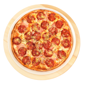 Sos pizza, sunca, salam, masline, ciuperci, mozzarella, oregano.