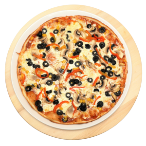 Sos pizza, masline, ciuperci, ardei, porumb, mozzarella, oregano.