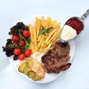 Ceafa de porc, cartofi prajiti, salata, sosuri, chifla